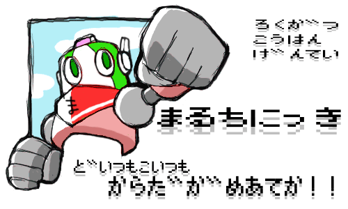 | 10月11日 ここ最近食生活が豆腐と納豆なヘルシーマルチですウー。豆で動くおかしなロボットですウげらげらげら、そしてうひゃひゃひゃひゃ(なつかしい) マルチは毎日ウーロン茶をがぶ飲みして生き長らえているですウ。ウーロン茶はとにかく安いのでマルチの財布にもやさしくて撫でてやりたいですなでなで。ところがウーロン茶ってなんか飲めば飲むほど痩せるとかいうらしいんでそこだけほんのり困り者。マルチさん最近また痩せてきて困ってきているというのにね。ぁぁもぅムカツク! 何かに激しく怒りを感じるマルチ!(迷惑) |